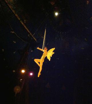 (Sarah :) " Pour l'écriture du spectacle, j'ai fait beaucoup de recherches sur la Birmanie, les contes birmans et je me suis rendue compte qu'il y avait toujours beaucoup d'animaux dans ces histoires, le spectacle s'ouvre donc sur une larve de papillon, d'où le nom du cirque et ce papillon est le fil rouge tout au long du spectacle. Nous avons également travaillé avec une chorégraphe anglaise pour travailler les déplacements. Mais le spectacle est comme nous, international, et nous espérons que les Birmans vont se retrouver également dedans. C'est pour cela que nous avons fait une scène en rond sur laquelle nous avons peint le monde. Et nous avons un magicien Birman qui présente aussi le spectacle, c'est un peu notre Monsieur Loyal, c'est Ko Khine, un magicien célèbre ici."