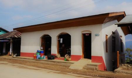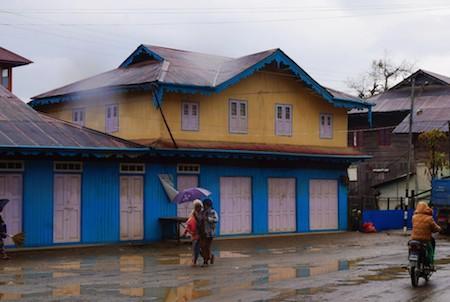 Enfin, une couronne de toits au sommet d’une crête fauve : Tiddim. Les rez-de-chaussée sont de briques, formant parfois d’élégantes arcades mélancoliques ; les étages de bois, eux, brillent de tons délicieux, allant du bleu tendre au jaune citron ; les toits à quatre pentes sont souvent ourlés de frises en bois ciselé. Couleurs vives et arcades ; bois sombre et cheminées : des airs de Caraïbes et de Jura, un mélange étonnant et savoureux. Par endroits, des entrepôts voûtés aux briques rongées par le temps évoquent l’ère coloniale, les administrateurs à moustaches et les caravanes de mules vers l’Inde.