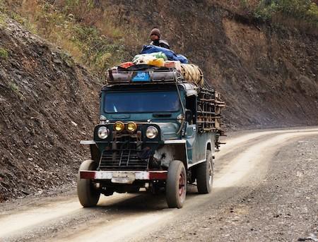 À peine dépassées les dernières maisons de bois de Tiddim : un vertige de lacets raides, cirés de boue, dévalant vers la rivière Myittha, qui roule des eaux indistinctes. Là, devant le pont suspendu élancé et peint d’un jaune canari aérien, une poignée de lourds camions, aux bâches tigrées de boue, immobiles et serrés comme un troupeau enlisé. Après une périlleuse descente debout sur les freins, les chauffeurs préfèrent ne pas tenter le diable en se lançant dans une ascension glissante et dangereuse. Somnolant dans leur cabine, renouant leur longyi, versant un thé fumant, tirant sur leurs cheroot en grelottant, ils attendent que la piste sèche pour reprendre leur chemin. Ils ont bien raison : après le pont, la route grimpe dur, les courbes sont trompeuses. Seules s’y hasardent les minuscules mais vaillantes motos chinoises surchargées, slalomant au ralenti dans les ornières comme un mulet ivre. Egalement ces longues jeeps japonaises bâchées, véritables bêtes de somme des collines Chin : sacs de riz, rouleaux de grillage, moto ficelé sur le toit, voire quelques porcs noirauds, tout effarés de mal des transports dans leur cage de bambou cylindrique. A travers la buée des pare-brise, entre les chapelets qui dansent au rétroviseur, on devine des sourires enjoués, des mélodies grésillant dans l’autoradio, et la joie de traverser la pluie bien au sec. Cette douillette euphorie retombe parfois : un virage mal négocié, une accélération mal dosée et le véhicule patine dans de tragiques envolées de boue, s’enfonçant jusqu’au châssis dans la glaise. Il ne reste alors plus qu’à caler un coin de bois derrière une roue… et à attendre.