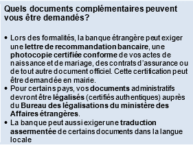 Il vous sera généralement demandé une pièce d’identité (passeport, carte nationale d’identité, carte de séjour…) et un justificatif de domicile. Certains pays sont plus exigeants concernant les documents à fournir. Les sites Internet des banques locales sont une bonne source d’information pour vérifier que vous emmenez bien tous les documents nécessaires. Il pourra également vous être demandé une lettre de recommandation d’une banque de bonne renommée. Cette lettre présente votre statut de client auprès d'une banque française et facilitera votre introduction auprès d'une banque étrangère. Pensez à la demander à votre conseiller avant de partir.