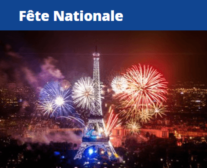 "Venez au Bal de la Fête Nationale française ! Le 14 juillet est le jour national français. Venez danser, écouter de la musique et découvrir d'autres surprises!"