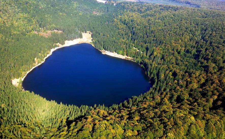 Seul lac d'origine volcanique en Roumanie, unique en son genre dans toute l'Europe Centrale et de l'Est, le lac Sfanta Ana s'est créé sur le fond du cratère d'un volcan éteint du Massif Ciomatu. Situé près de Baile Tusnad, ce lac, ayant la forme d'une palette d'un peintre est loin d'être un havre de paix. Entouré de plusieurs légendes sanguinaires dont l'une fait référence à une jeune femme, Ana, qui, forcée par ses parents de prendre en époux un homme riche qu'elle n'aimait pas, se jeta par désespoir dans le lac, donnant ainsi le nom au lac. D'après la légende, son corps n'a jamais été retrouvé. Pas d'angoisse, c'est aussi un lieu de pèlerinage, car à proximité se trouve une petite chapelle catholique en bois, datant du 12ème siècle, inclinée à Sainte Anne. On raconte que Sainte Anne aiderait les jeunes gens à trouver leur moitié. Quelques autres étrangetés au sujet de ce lac entouré de mystère: on dit que son niveau d'eau ne baisse jamais alors qu'il n'est alimenté que par les précipitations, et que la pureté de son eau avoisine celle de l'eau distillée.