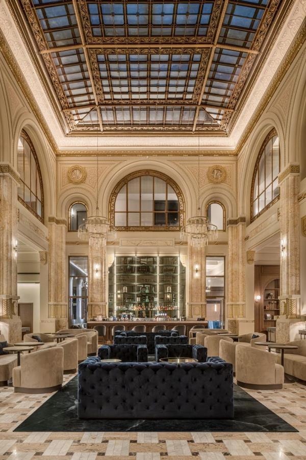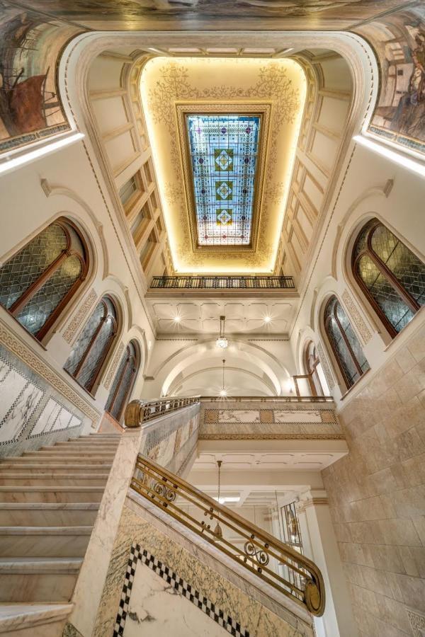 A l'intérieur, le résultat est tout aussi bluffant: tout est fait pour mettre en valeur le patrimoine architectural Art déco et Art nouveau des lieux, évoquant la magie de la Belle Époque. Dès l’entrée, on est frappé par le monumental escalier en marbre, l'impressionnant plafond de verre, les immenses miroirs, les somptueux lustres, la mosaïque restaurée, le parquet d’origine, le fer forgé, les boiseries, les dorures, les corniches ou les anciens guichets de la banque… On y trouve aussi plusieurs peintures réalisées par Cecilia Cuţescu Stork. Tous ces éléments architecturaux de haute volée rappellant le passé fastueux de la banque.