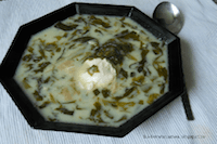Entre temps, prenez les trois ?ufs et une petite cuillère de farine et préparez une omelette simple dans une poêle anti-adhésive. Coupez-la en morceaux d'environ deux centimètres et mettez-les dans la soupe avant de couper le feu. Versez dans un bol quelques louches de soupe et attendez que sa température diminue un peu. Dans ce bol ajoutez la crème aigre ou le yaourt et les gousses d'ail écrasées tout en remuant énergiquement. Ajoutez enfin le contenu de ce bol - que les cuisiniers roumains appellent ''liaison'' - dans le potage. Ajoutez pour finir deux ou trois cuillerées de vinaigre et un mélange d'aneth, de persil et de livèche finement hachés.