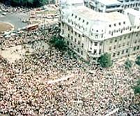La minériade de juin 1990 sur la place de l'université à Bucarest (photo: antena3.ro).