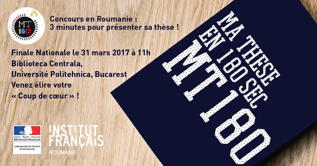 Vendredi dernier, en partenariat avec L'Institut Français de Bucarest, nous avons participé en tant que membre du jury cette fois-ci, au concours «Ma thèse en 180 secondes». Comme son nom l'indique, l'intérêt de ce concours est la présentation d'un sujet de thèse par un doctorant à un public profane, le tout en français et en 3 minutes maximum ! Parmi les 3 meilleurs candidats nationaux, le gagnant aura la possibilité de se rendre en Belgique en septembre prochain pour représenter la Roumanie à la finale internationale de ce concours qui réunit plus d'une quinzaine de pays.