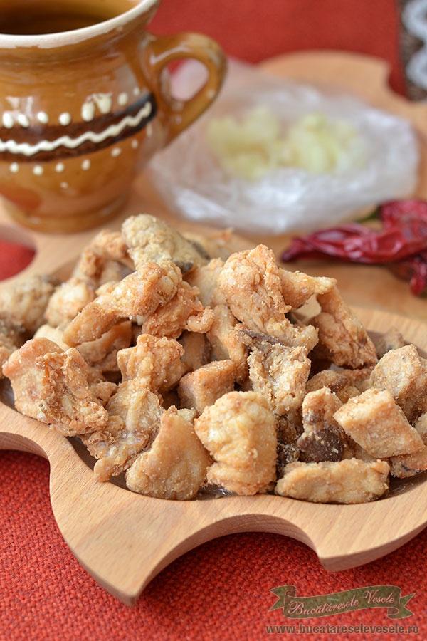 Mais le confit est également une des techniques de conservation du lard et de la viande de porc les plus répandues dans la cuisine traditionnelle roumaine. On fait cuire dans de la graisse de porc des morceaux de viande et de lard que l'on garde ensuite dans du saindoux pour les utiliser dans la cuisine de tous les jours. Aujourd'hui, je vous fais découvrir les morceaux que ce l'on appelle ici « jumari », soit des morceaux de lard bien dorées qui vont à merveille avec des oignons, de l'ail et un ou plusieurs verres de tuica, eau de vie de fruits, principalement prunes.