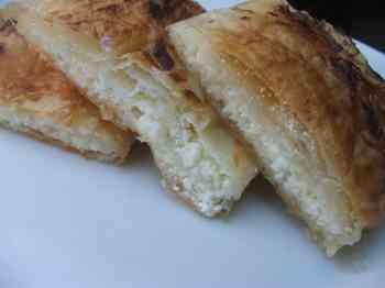 Préparez la pâte en mélangeant la farine avec l'eau tiède et le sel. Lorsqu'elle est prête, laissez reposer pendant 1 heure. Déposer la pâte sur la table farinée. Etirez délicatement la pâte pour recouvrir toute la table. Mélangez le fromage blanc avec du beurre et du sel. Badigeonnez de matière grasse liquide. Déposez le fromage blanc sur toute la pâte et badigeonner de crème fraîche. Roulez la pâte à l'aide d'un linge en formant une bande plate de 10 cm. Découpez en trois et les espacer sur une plaque à pâtisserie graissée. Badigeonnez encore une fois de crème fraîche et enfournez dans un four préchauffé.