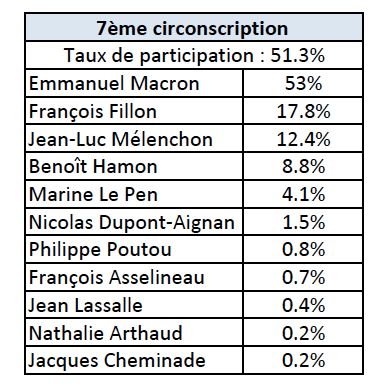Les résultats de la 7ème circonscription qui comprend l'Europe centrale et orientale placent en tête Emmanuel Macron avec 53% et François Fillon avec 17,8%. Jean-Luc Mélenchon arrive en 3ème position (12,4%) loin devant Marine Le Pen qui obtient 4,1% des suffrages.