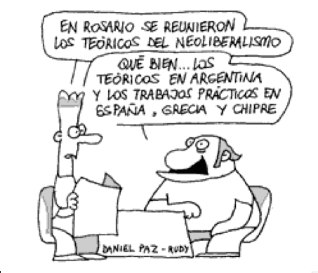 Cette caricature de Daniel Paz et Rudy, publiée par le quotidien Página 12, met en parallèle des rencontres à laquelle certains partisans du néolibéralisme étaient invités et la crise qui affecte particulièrement certains pays d'Europe.