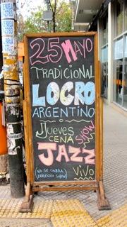 A l'entrée de ce restaurant, une pancarte affiche une carte spéciale pour le 25 de mayo. Au menu : le traditionnel locro argentino. Ce ragout à base de courge, de maïs et de haricots est le 25 mai le repas de nombreux Argentins.