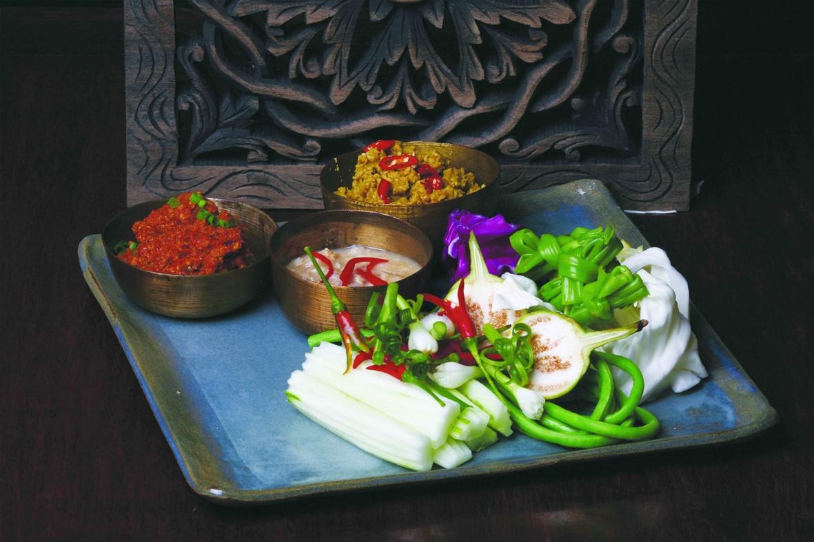 Le plus traditionnel : Trois types de Prahok servis avec des aubergines, des haricots kilomètres et des feuilles de chou