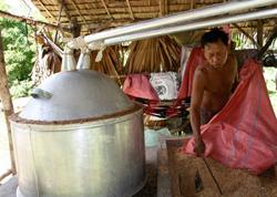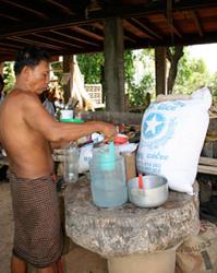 « Il y a trois étapes dans la production d'alcool », explique Do Lun. « La première fournée est extrêmement forte et n'est pas faite pour être consommée. La deuxième étape est la meilleure avec 30% de composition d'alcool, quant à la troisième, elle est très faible. Je mélange souvent la première et la troisième fournée pour crée une mixture équilibrée ». De sa maison en bois, au beau milieu d'une rizière et de champs de pâturages, Dos Lun vend son alcool de riz naturel à 2000 riels le litre, il lui arrive d'écouler jusqu'à 20 litres par jour. « Les gens aiment m'acheter de l'alcool de riz parce qu'ils savent qu'il est naturel, et qu'il n'est donc pas nocif pour eux » vante t-il. « Car attention, certains producteurs qui vendent en gros dans les magasins ou même directement dans la rue ajoutent des pesticides, ou des produits chimiques juste pour relever le goût, mais au final cela vous rend seulement malade ».