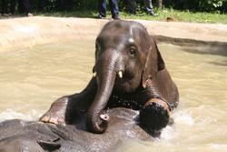 Chhouk s'amuse dans la piscine avec son ami Lucky au Centre Tamao Wildlife (Crédit photo-The PPPost, Tracey Shelton)