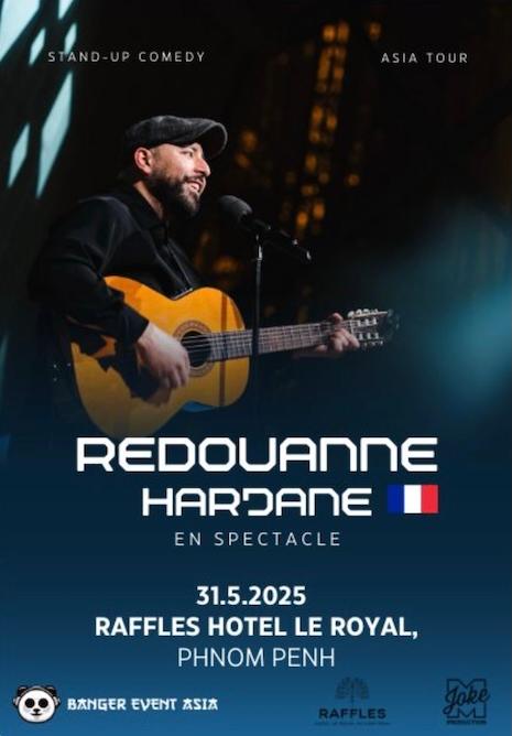 L’humoriste et musicien français Redouanne Harjane se produira pour la première fois au Cambodge dans le cadre exceptionnel du Raffles Hotel Le Royal, le samedi 31 mai 2025 à 20h30, à l’invitation de l’agence Banger Event Asia, en collaboration avec Confluences.