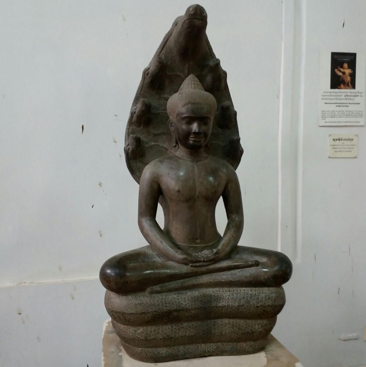 En position de méditation profonde, le bouddha est assis sur le roi des nagas, un grand serpent à sept têtes. Celui-ci le protège des intempéries qui ont fait rage pendant une semaine. Bouddha ignore la tempête car il est soulevé par le naga au-dessus des vagues. Ce serpent est considéré par les bouddhistes comme un gardien qui est le médiateur entre la terre, le ciel et l’au-delà.