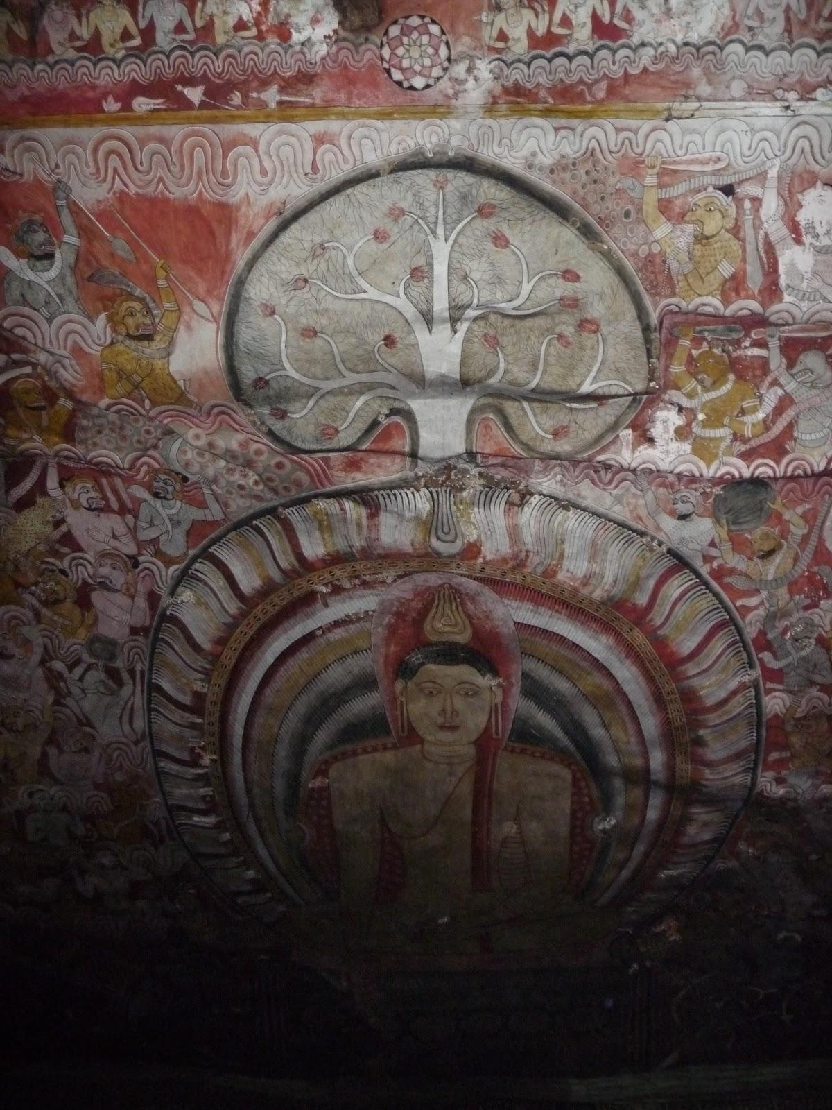 Bouddha s’était isolé dans la forêt afin de s’éloigner des disputes entre ses disciples et trouver la paix. Le roi des éléphants vint lui nettoyer son siège et lui offrit de l’eau et des fruits. Le bouddha accepta l’offrande de celui-ci (représenté avec sa main ouverte) mais pas celle du singe, qui apportait du miel (son autre main est fermée).
