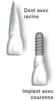 C'est une racine artificielle en titane qui va remplacer la dent naturelle perdue, et qui va supporter une couronne ou un élément prothétique. Le titane s'oxyde instantanément a l'air, cet oxyde a une excellente biocompatibilité avec l'os.