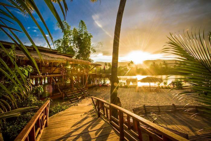 Construit sans couper un seul arbre, l’écolodge s’intègre parfaitement dans son environnement naturel. Un pont en bois mène les visiteurs à travers une mangrove paisible jusqu’à une plage privée bordant la rivière.