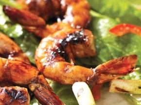 Faire mariner pendant deux heures au réfrigérateur les crevettes entières avec leur carapaces dans un mélange de : huile d'olive, citron, vinaigre balsamique, menthe et céleri hachés, piment, coriandre. Enfilez les crevettes sur une pique de bois, rajoutez un grain de raisin et faites griller au barbecue quelques minutes de chaque côté