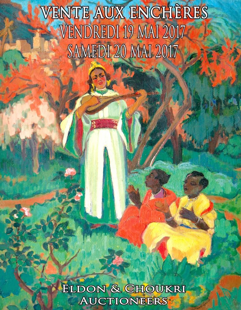 Eldon & Choukri Auctioneers organise une vente aux enchères de 427 ?uvres d'art sur deux jours, le vendredi 19 mai à partir de 18h et le samedi 20 mai 2017 à partir de 17h00 (au 100 Avenue Moulay Rachid, Anfa, Casablanca). L'exposition publique se tient jusqu'à jeudi 18 mai de 10h à 13h et de 15h à 20h00.