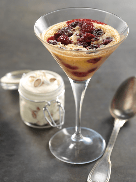 5. Présentation : au moment de servir, disposer les éclats de dragées sur la crème mascarpone. Présenter un clafoutis aux cerises accompagné de sa verrine de crème mascarpone afin que les convives puissent verser eux-mêmes leur crème mascarpone sur les clafoutis.