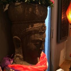 Nous restons éblouis par le talent des décorateurs, par le mélange des couleurs et textures. Notre regard se perd parmi tous les souvenirs ramenés de voyage entre autres, le Bouddha au fond du salon qui se tient majestueusement, comme pour nous envoyer du bon karma. Quelques masques, des figures d'autres cultures sont dispersés dans tout le salon de thé, presque comme dans un musée où nous découvrons peu à peu les diverses influences. Tout est dans l'équilibre et l'harmonie, nous nous y sentons tout simplement apaisés.