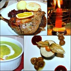 De façon presque instantanée, je me sens bien et à l'aise; la lumière ni trop tamisée ni trop éblouissante, des couleurs chaudes et harmonieuses, différents tons de rouge, de noir, brun et blanc, des textures variées- de l'étoffe légère des rideaux mettant en valeur cette grande baie vitrée aux chaises très confortables en velours ou même les serviettes de tables assorties à la couleur des bougies. Je sens l'attention extraordinaire portée aux détails. Partout où mon regard se pose, je ne remarque que précision et méticulosité. C'est à ce moment que le maître des lieux me propose de façon très courtoise de prendre soin de mon vestiaire. Je suis sous le charme et j'ai même le sentiment que le traitement royal ne fait que commencer. Un petit apéritif plus loin, je découvre le choix d'un menu de saison et aussi à la carte: je suis tentée de me lancer jusqu'au bout et commande trois plats; en entrée, une soupe de petits pois gourmands agrémentée de grosses crevettes, suivie par de l'oie pour rester de saison avec du chou rouge au cassis et au coing, une pomme confite à la pâte d'amandes et un délicieux «Klößen» - sorte de boulettes de pain et de pommes de terre, recette traditionnelle allemande de fin d'année pour terminer avec une mousse blanche de marrons entourée de chocolat noir et de quelques châtaignes. Dans ce monde limbourgeois alliant finesse et distinction, le temps semble s'être arrêté et le bon goût reprendre sa place au centre des festivités.