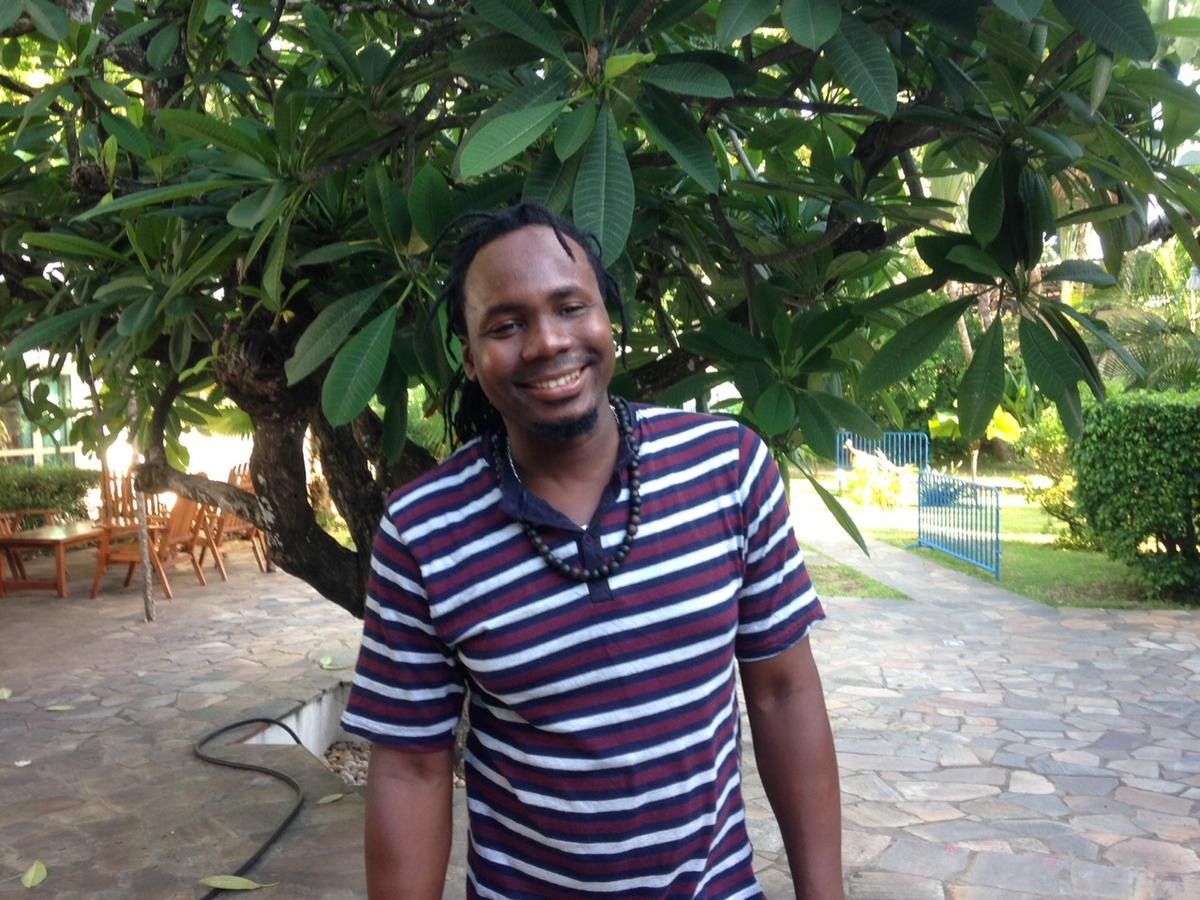 Un jour j'avais récupéré des chutes de toiles que les artistes utilisaient et j'ai commencé à gribouiller dessus, à peindre. A l'époque le thème de l'exposition était la pollution. J'ai donc peint sur les chutes de tissus des artistes et ai laissé mes « toiles » sécher au soleil. C'est là qu'un monsieur s'est arrêté et a demandé qui avait fait ça. On m'a appelé en disant que c'était moi le petit qui avait dessiné ça. Le monsieur a demandé si c'était moi l'artiste et là j'ai été très étonné qu'on m'appelle ainsi. Le monsieur m'a alors demandé combien coutait ma toile. J'étais paniqué et ne savais pas quoi répondre. Un artiste à côté de moi m'a soufflé de lui demander 40,000 FCFA et le monsieur a accepté.