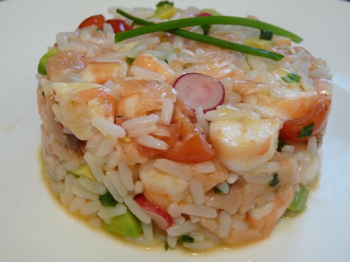 Mélanger le tout dans un saladier avec le riz, ajouter l'huile d'olive, le jus de citron, assaisonner avec la fleur de sel et le piment d'Espelette. Mélanger délicatement.