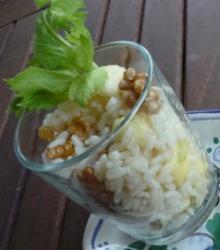 Ajoutez tous les autres ingrédients : le céleri et les deux pommes coupés en morceaux, les raisins secs trempés au préalable dans le vin puis égouttés, les noix, les feuilles de menthe hachées menu, le jus d'un demi citron.