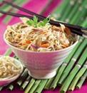 Faites tremper les pâtes 2 à 3 minutes dans de l'eau froide. Faites chauffer de l'eau dans une casserole et salez. Coupez le poulet en fines lanières, les oignons en fines lamelles et les carottes en rondelles. Faites cuire les pâtes pendant 3 minutes.