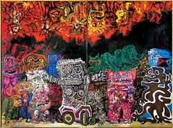 Pesadilla de los injustos o La conspiración del mundo de Juanito Laguna trastorna el sueño de los injustos, d'Antonio Berni : ce diptyque de grandes dimensions (3 m X 4 m) a été peint par l'artiste en 1961, une vingtaine d'années avant sa mort, en 1980. Il a été exposé pour la première fois à la galería Witcomb dès l'année de sa conception. En novembre dernier, le Museo Nacional de Bellas Artes a acquis ce tableau auprès de la fille de Berni. L'?uvre appartient à la série Juanito Laguna (1960-1978) qui raconte l'histoire de l'enfant éponyme, né dans une villa miseria du Bajo Flores. Cette zone a longtemps accueilli des décharges à ciel ouvert, fouillées par des malheureux en quête de matériaux à revendre. "De fait, pour réaliser l'?uvre, Berni a mêlé à la peinture des produits de rebut qu'il a collectés à Flores même, lors d'un travail d'observation sur deux ans, avec prise de photos et notes", raconte Nora Iniesta. Avec Juanito, "Berni montre un monde sans équité ni échelle humaines". Et de conclure : "Ainsi naît la figuration narrative, qui succède au formalisme dans les années 60".