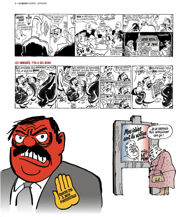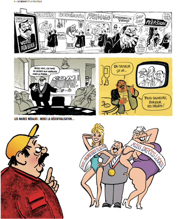 Comme tous les humoristes, nous cherchons des têtes qui représentent la bêtise, des faire-valoir. Mon personnage est ici négatif. J'ai fait autrefois un personnage plus positif, un lycéen qui est du bon côté. Il réfléchit avant de parler, ça s'appelait le Grand Duduche. Le Beauf c'est le Français moyen, râleur qui a tous le défauts, qui n'a pas vraiment une réflexion personnelle, qui répète ce qu'il entend à la télé ou au bistrot. Et toujours en colère contre quelque chose. Il a besoin de boucs émissaires, il se sert des étrangers. Là, physiquement, c'était un patron de bistrot que j'ai connu dans ma ville natale de Châlons-sur-Marne. Un type à moustaches. Le café existe toujours, le patron est désormais le fils. Nous étions allés faire un reportage pour FR3 Nancy il y a quelques années et le journaliste lui avait dit : "Vous savez que votre père a servi de modèle au dessinateur Cabu pour le personnage Le beauf ?" Il a répondu "Pour faire le quoi ?!" En fait il ne savait pas ce qu'était un beauf ! (rires). En général, les beaufs ne savent qu'ils sont des beaufs. Donc on prêche que des convaincus, enfin, on fait rigoler que des convaincus ! Mais tout ça ne sert pas à grand chose, à part faire rire.