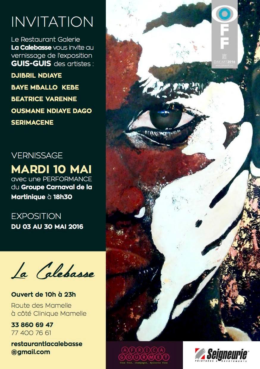 Le restaurant - galerie La Calebasse vous invite au vernissage de l'exposition GUIS-GUIS des artistes Djibril Ndiaye, Mbaye Ballo Kebe, Béatrice Varenne, Ousmane Ndiaye Dago, Serimacene.