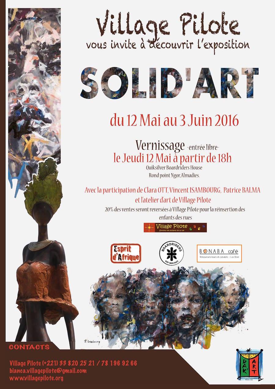 Village Pilote vous invite à découvrir l'exposition SOLID'ART, qui aura lieu dans le cadre de la 12ème Biennale de l'Art Africain Contemporain de Dakar (Dak'Art). Cette exposition offre la possibilité à plusieurs artistes, aussi bien des professionnels que des jeunes amateurs en provenance de l'atelier d'art plastique de l'association Village Pilote, de partager leur travail. C'est l'occasion de réunir plusieurs partenaires autour d'une manifestation artistique dans une ambiance chaleureuse et conviviale. Cet évènement permettra également de mobiliser des ressources pour la prise en charge des enfants de l'association Village Pilote. En effet, 20 % des recettes des ventes seront reversés aux projets de réinsertion des enfants de la rue accueillis par Village Pilote.
