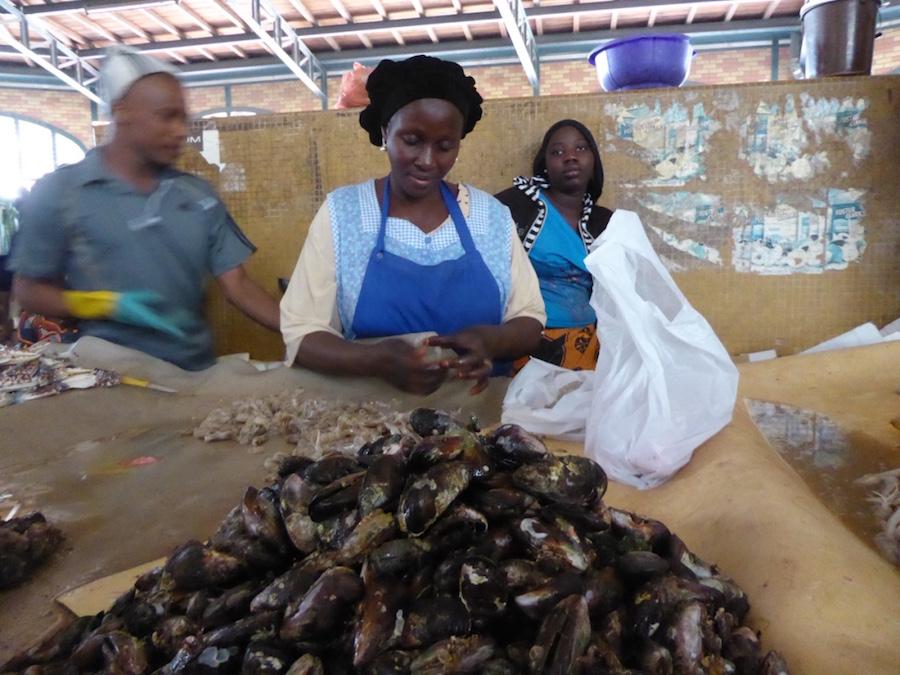 Préparation des crevettes fraîches au marché Kermel. Photo P.B.