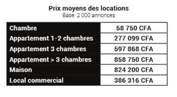 - Dans sa dernière newsletter, Mamaison.sn a indiqué les prix moyens des locations selon le type de bien (à partir de 2000 annonces).