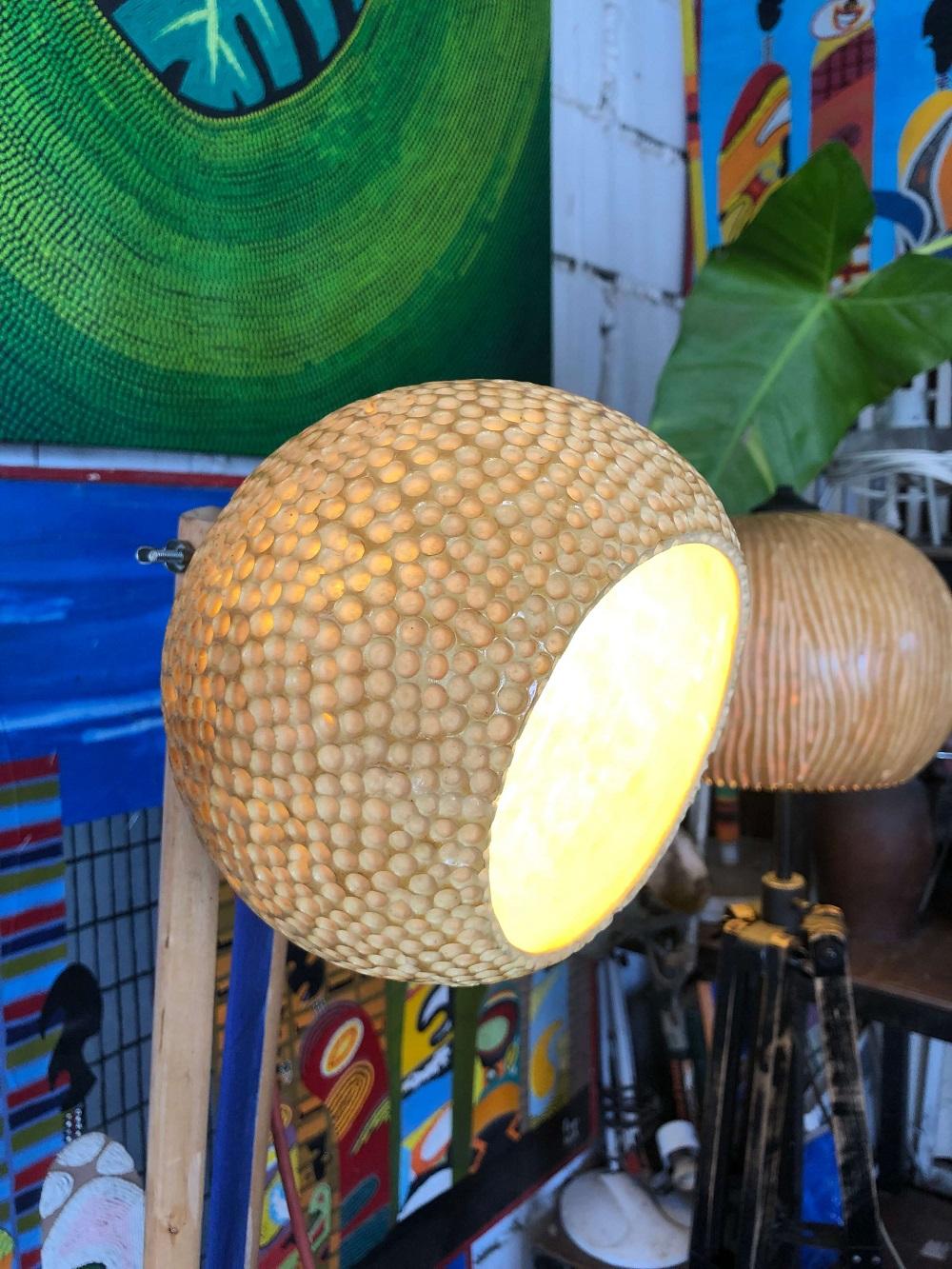 Abdoulaye Mbaye nous emmène dans le quartier de la Biscuiterie à Dakar découvrir son atelier, situé sur la terrasse de la maison familiale où il a grandi. A l’intérieur, des tableaux et des luminaires réalisés à partir de calebasses et de perles. Et dans un coin, quatre lampadaires design, réalisés à partir de calebasses gravées, de bois et de matériel de récupération. Ces modèles, il les a fabriqués suite à l’atelier Keur Design qu’il a suivi en mai 2018 (cf. lire l’encadré plus bas pour en savoir plus). Il avait appris par les réseaux sociaux l’existence de cette formation pour revisiter les objets du quotidien et avait candidaté immédiatement.