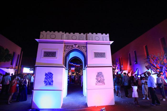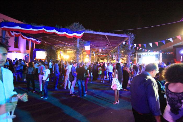 L'ambassadeur de France a convié les français du Sénégal ainsi que leur famille ou amis à cette grande fête nationale. L'heure est donc à la célébration nationale et au rassemblement. A l'entrée on est directement accueilli dans un cadre festif et la musique bas son plein. Un effort dans le décor donne tout de suite à la fête une ambiance « à la française ». D'ailleurs, au milieu de la cour du lycée, reconvertie pour la soirée, trône l'Arc de Triomphe miniaturisé. De part et d'autre, se répartissent les stands de restauration et de boisson, lieux dans lesquels les invités peuvent se reposer entre deux danses. Sur la droite, un concert offre à la fois musique internationale comme variété française, histoire de rappeler les souvenirs d'enfance.