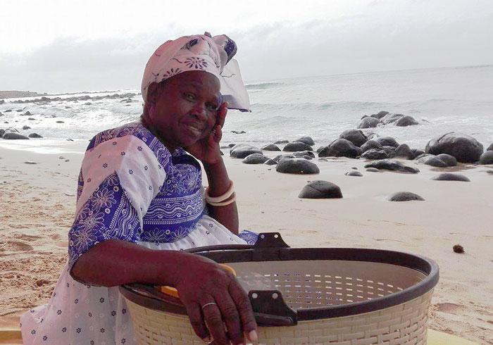 En bord de mer, au Virage précisément, non loin des cabanes de surfeurs et des restaurants, des silhouettes colorées, paniers au bras, déambulent de tables en tables. Mama Coucou est l'une d'entre elles. Dans sa corbeille, beignets, nougats et sachets de cacahouètes se superposent. "Tous les matins je vais au marché puis je cuisine. Pour la sauce des beignets, je fais revenir des oignons avec des tomates et un peu de piment. Les nougats eux sont composés de cacahouètes et de sucre avec un peu de beurre. Sinon, je vends aussi des cacahouètes salées simples", renseigne cette mère de famille de 58 ans. La nourriture solide, elle s'y est mise depuis 1992, avant cela ? Mama Coucou vendait des jus : bissa, bouye, mangue. "Les jus ne me permettaient pas de gagner assez donc j'ai dû chercher autre chose pour compléter", indique-t-elle. Originaire d'une petite ville non loin de Touba, Mama Coucou a quitté famille et ami pour venir s'installer dans la capitale sénégalaise avec son mari et sa fille. "La vie n'est pas plus facile contrairement à ce que l'on pensait. Il y a des journées où je ne gagne rien et d'autres où j'atteins les 5000 Fcfa. Au moins ma fille reçoit une bonne éducation ici".