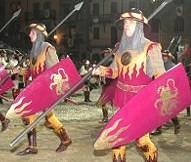 La "Giostra del Saracino" (la Joute du Sarrasin) est l'une des plus célèbres commémorations historiques d'Italie. Ses origines sont très anciennes : certains affirment qu'elle existait déjà en l'an 1200, d'autres avec plus de certitude font remonter ses origines à l'an 1400. Le document le plus ancien que l'on connaisse toutefois, date du 6 août 1535. Surprenant quand on sait que les autorités de l'époque promulgaient des décrets interdisant les jeux. Il n'y a pas de doute, ce sont à la fois les incursions sarrasines jusqu'à Arezzo et les Croisades, qui ont donné naissance à la Joute du Sarrasin.