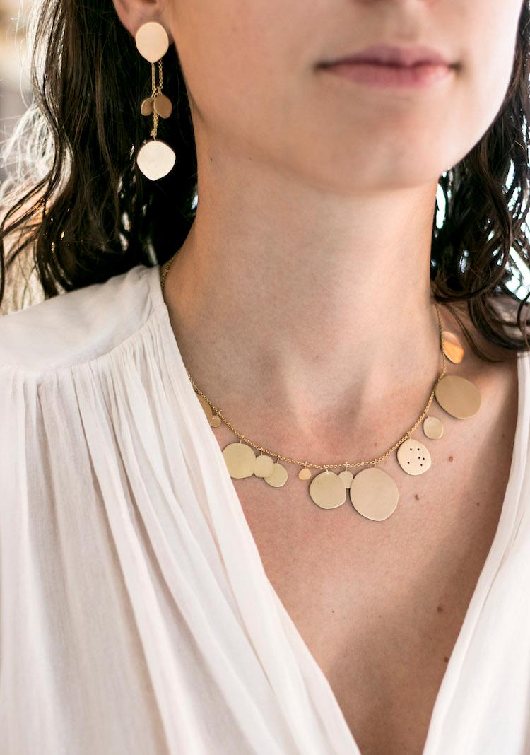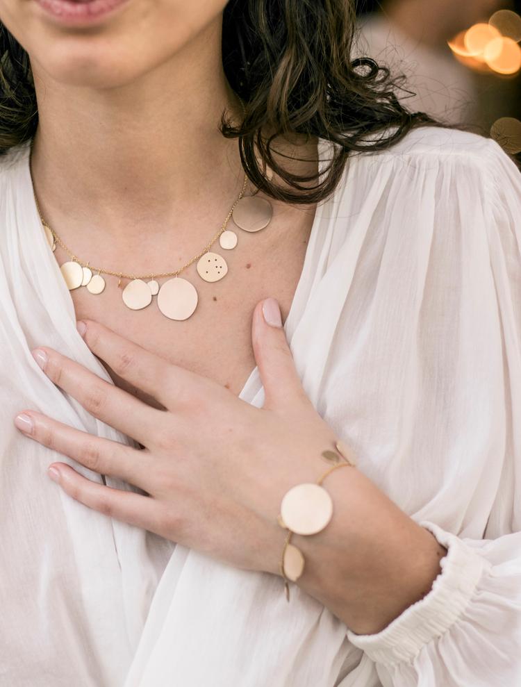 Le lancement de ces derniers modèles de la collection s’intitule « Dots ». L'ensemble se compose de simples plaques d'or rondes, lisses et légères qui feront toute la différence pour celle qui les portera. La finesse ainsi que la taille unique de chaque cercle créent un superbe look bohème chic.