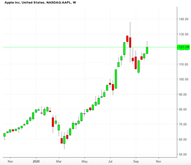 Depuis le rebondissement après les creux du crash boursier du coronavirus au début de 2020, le titre Apple a surperformé le marché en général.