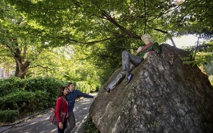 Il se peut même que vous remarquiez quelques-uns de nos auteurs tapis au coin des rues ou cachés dans des parcs, alors ouvrez l'œil pour repérer George Bernard Shaw à la Galerie nationale ; Oscar Wilde nonchalamment allongé à Merrion Square et Brendan Behan veillant sur le Royal Canal.