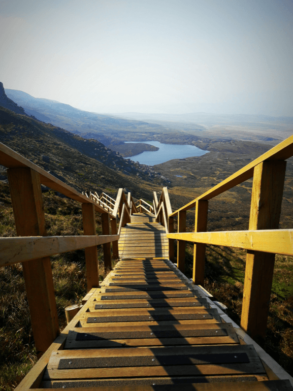 Après 20 minutes de marche nous rejoignons le fameux Cuilcagh Legnabrocky trail, parcours géant de bois bâti afin de préserver la biodiversité de l'érosion naturelle.