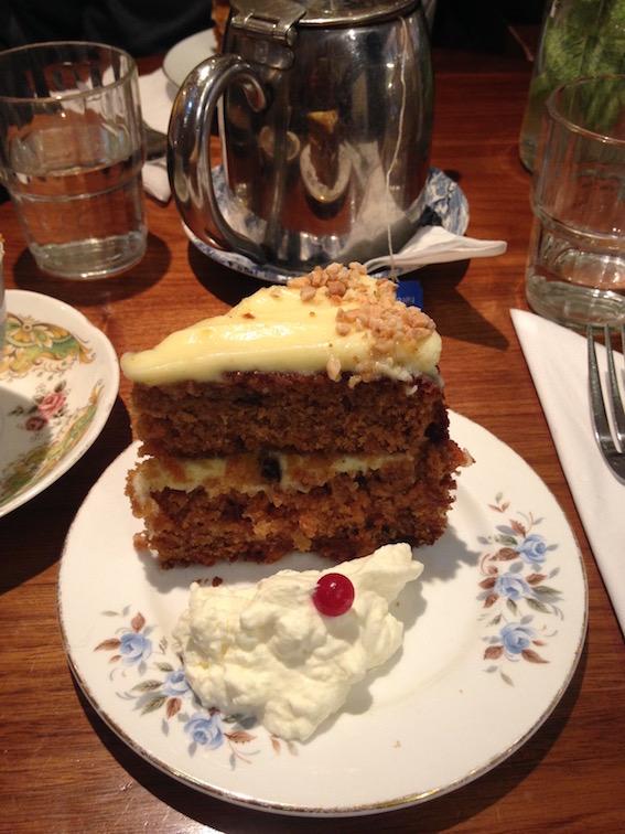 Après seulement quelques minutes d'attente, la voici, la voilà : l'énorme part de carrot cake nappée de son glaçage. Une merveille pour les yeux (si vous vous retenez de ne pas vous jeter dessus immédiatement). Il est agréable de noter que la présentation compte : le thé qui l'accompagne est servi dans un très joli service de style victorien. On se sent transporté dans « Orgueil et préjugés » au moment du « tea time ».