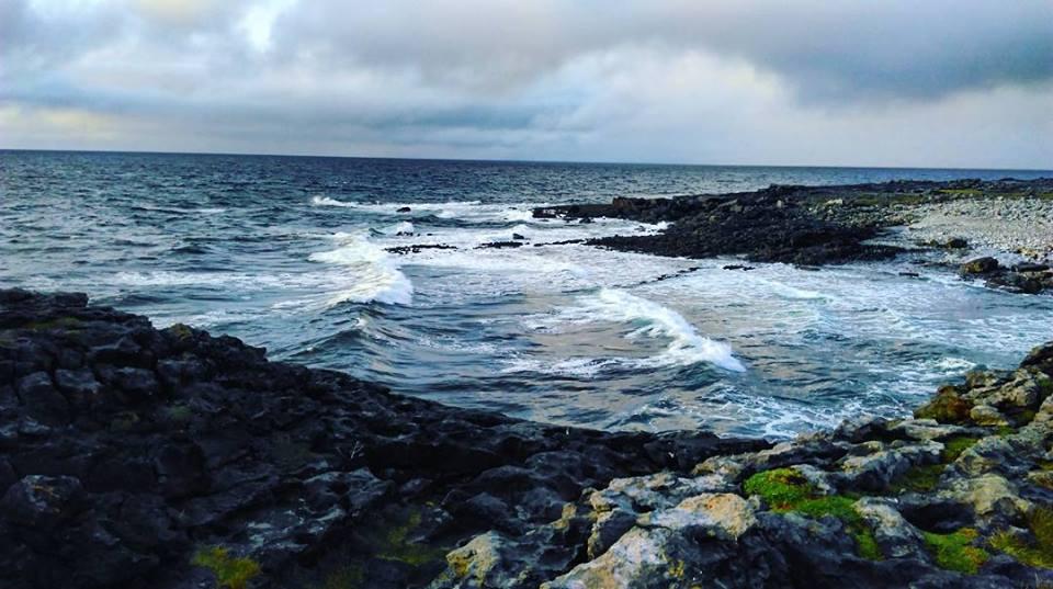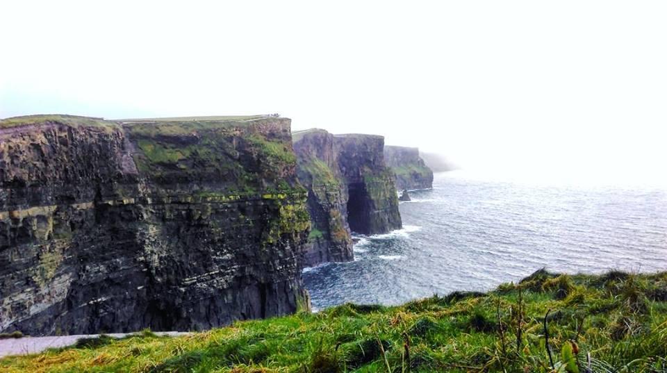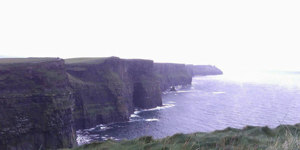A peine le temps de déjeuner et de visiter les quelques magasins qui bordent la petit route (dont une géniale boutique de chocolat tenue par une femme adorable), que la troupe remonte dans le bus pour l'attraction principale de la journée : Cliffs of Moher, les gigantesques falaises connues dans le monde entier. S'il y a bien une chose qui n'est pas décevante dans ce bus tour, ce sont bien ces rochers de plus de 250 mètres de haut à couper le souffle, théâtre d'une scène du sixième opus de la saga du plus célèbre des sorciers, Harry Potter et le Prince de sang-mêlé. Le panorama est sans égal malgré les aménagements de l'homme qui se fondent plutôt bien dans le paysage pour garantir la sécurité et permettre à ceux qui ont le vertige de profiter sans peur. On se sent petit face à ce géant de calcaire de 8 kilomètres de long où trône la Tour O'Brien. Encore une fois, impossible de louper une photo : tous les dix mètres on découvre un nouvel angle, quelque chose qui était caché. Bref, c'est absolument sublime et on comprend vite pourquoi les Cliffs sont l'un des endroits les plus visités d'Irlande. Néanmoins, l'heure et demie prévue par la compagnie passe très (trop) vite et la visite est forcément soumise aux aléas d'une météo capricieuse. En l'espace de trente minutes, le paysage majestueux éclairé par un soleil qui révèle chaque aspérité de la pierre peut laisser place à une brume épaisse, accompagnée d'une solide pluie, dans laquelle on ne voit pas à cinq mètres devant. La première chose à faire avant de réserver le bus tour est donc de vérifier la météo aux abords des falaises si on espère les voir. Avant de remettre le cap sur Galway, le conducteur fait un dernière halte, clou du spectacle de cette journée, sur la côte au couché du soleil. L'endroit en deviendrait presque cliché si la beauté du lieu n'était pas aussi grande.