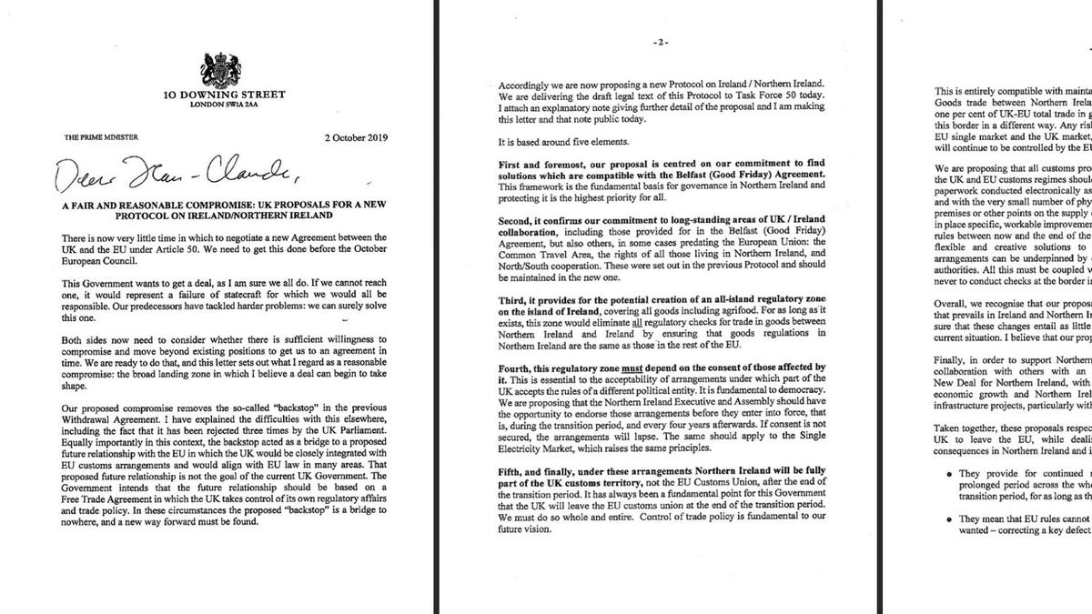 Bien que la sortie de l’union douanière signifie qu’il y aura une frontière douanière entre la province britannique d’Irlande du Nord et la République d’Irlande, qui restera membre de l’UE, le plan de Boris Johnson ne prévoit pas de contrôles « ni à la frontière ni même près de la frontière ».