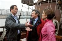 Jean-Louis Borloo (C) et la secrétaire d'Etat à l'ecologie Chantal Jouanno (D) avec l'explorateur Patrice Franceschi (G), sur La Boudeuse, le 27 février 2009 à Paris